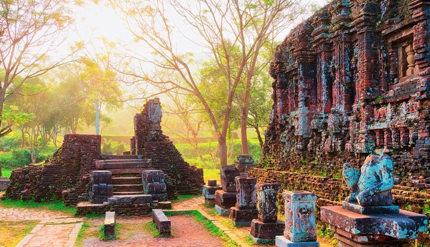 Heading west to My Son Sanctuary - the ancient architectural ruins in the middle of forest. Located among the greenish beauty of Hon Quap (Cat’s Tooth Mountain) and Thu Bon River., My Son is a complex of Hindu temples that were constructed by the Champa Kingdom which ruled the Central and Southern part of Vietnam, from the 3rd century until 1832.