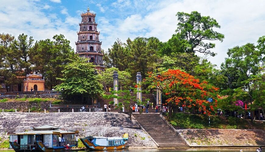 Proceed to ride the sampan boat on the Perfume River on the way to Thien Mu Pagoda.